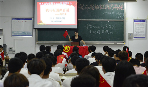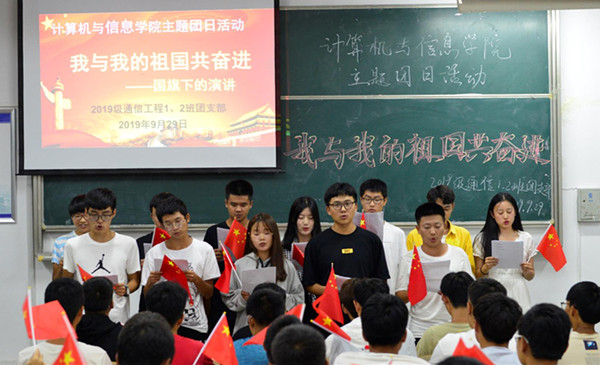 手拿国旗,共唱国歌,祝福祖国生日快乐……9月29日晚,8846威尼斯通信工程专业2019级的两个班在文渊楼203教室举办了“我与祖国共奋进”的团日活动,近100名同学在国歌声中展现自己对祖国的祝福。