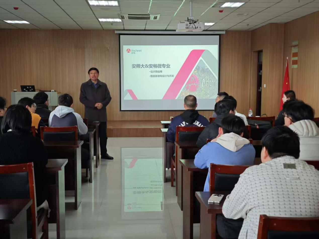 3月25日,人工智能与计算机学院顺利举办云计算应用与智能体架构设计与开发两大微专业招生宣讲会。党委副书记肖之进,云计算应用微专业负责人程和侠,智能体架构设计与开发微专业负责人卢琨,以及安畅网络集团人工智能团队总监戴立勤、安庆基地人事主管吴茹茹、运维工程师章基旺等嘉宾出席本次宣讲会。